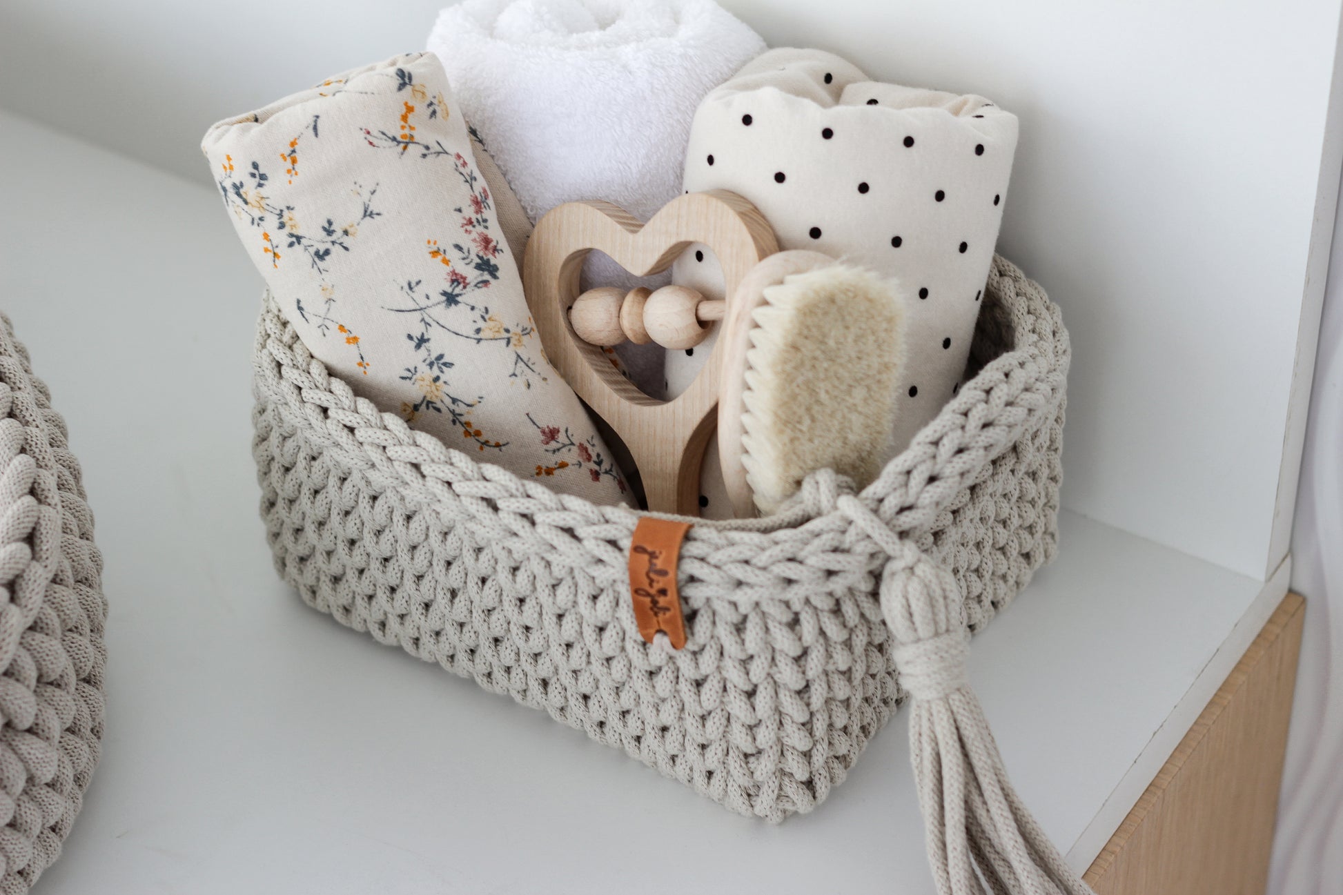 Crocheted Storage Baskets with nice and playful tassels - is a great, beautiful and very comfortable solution to arrange the changing table space. They will be helpful to storage diapers, nappies, baby care products and much more. Everything you need to take care of your baby is at your fingertips and beautifully organized.