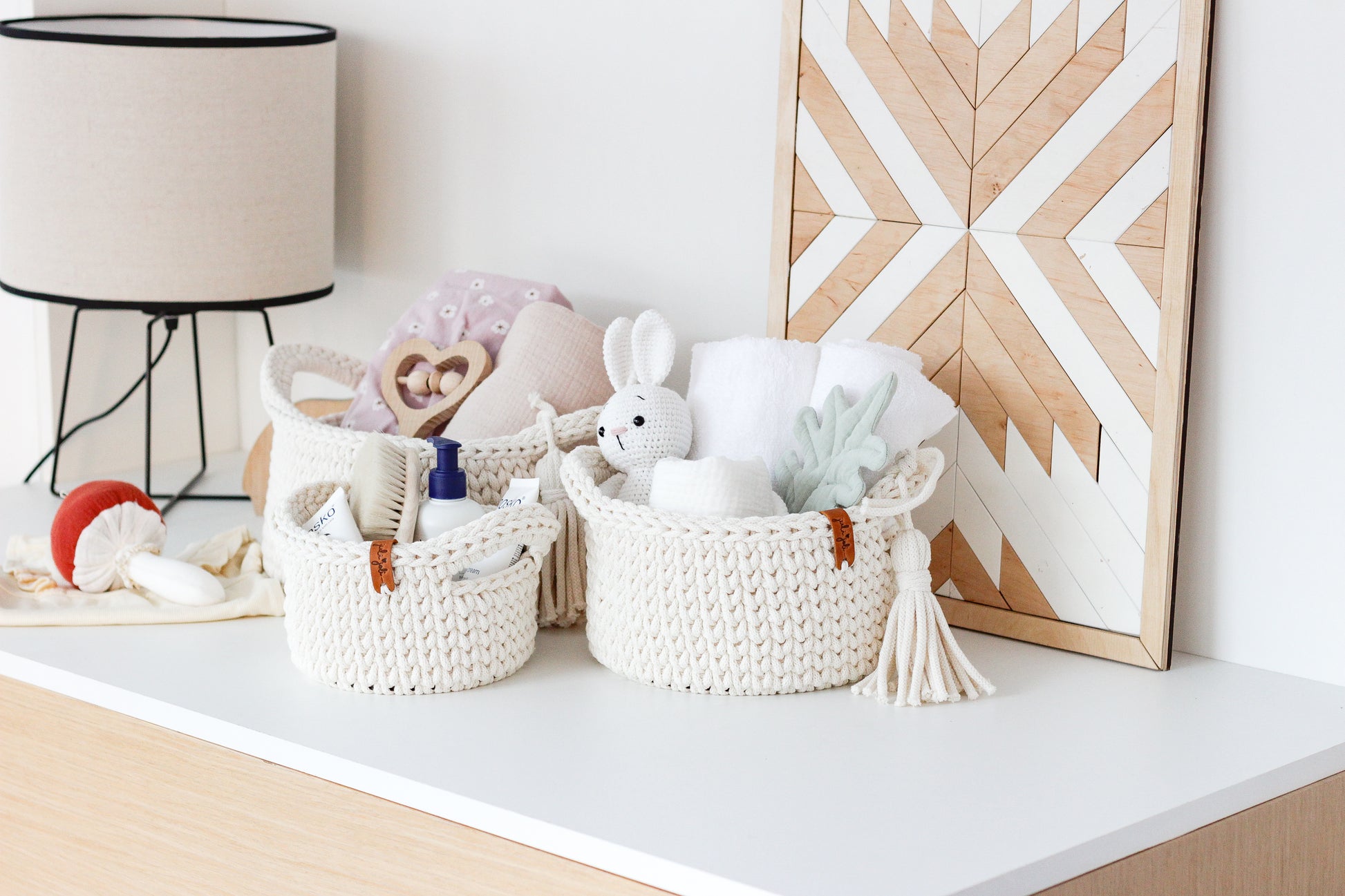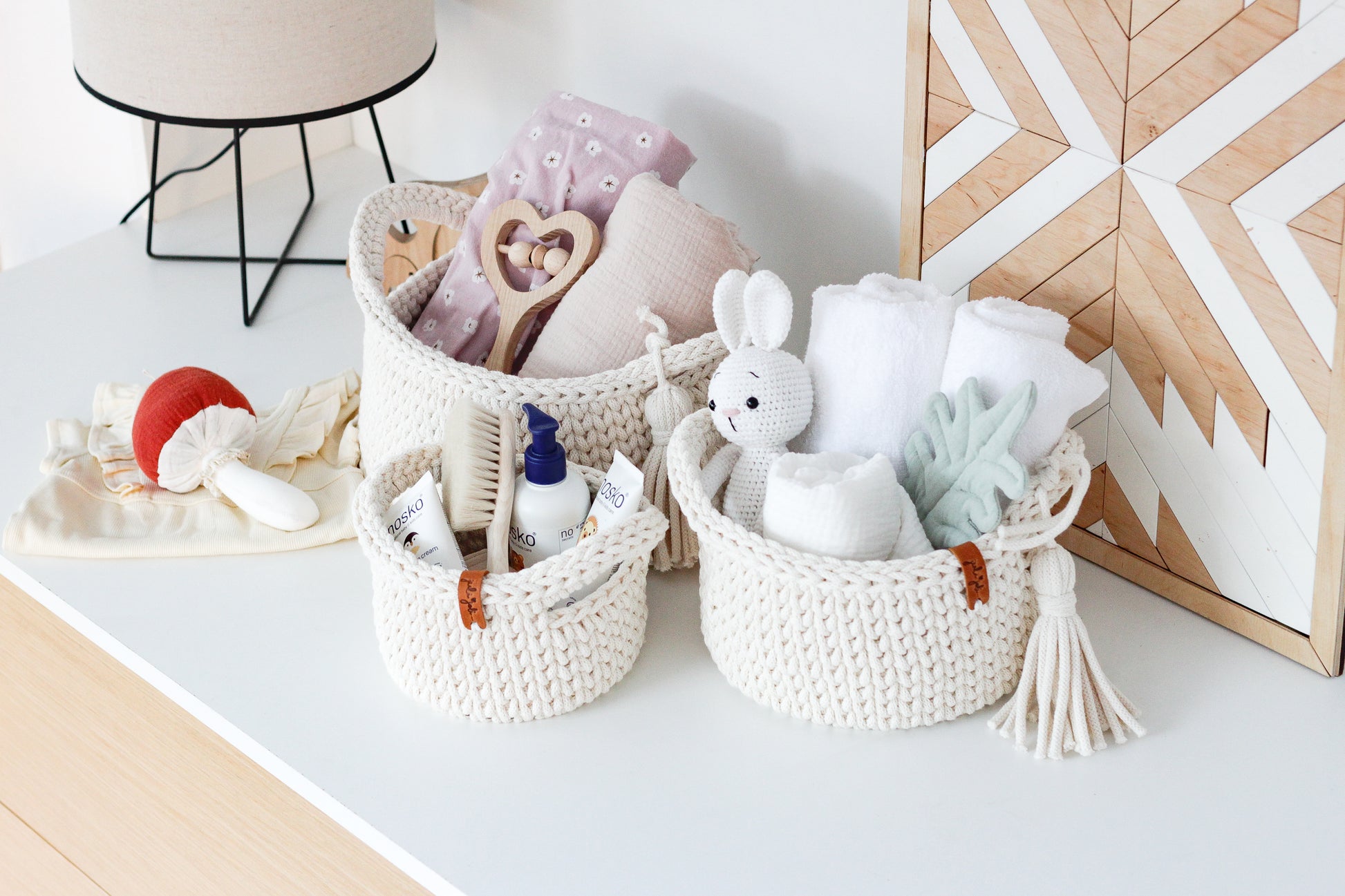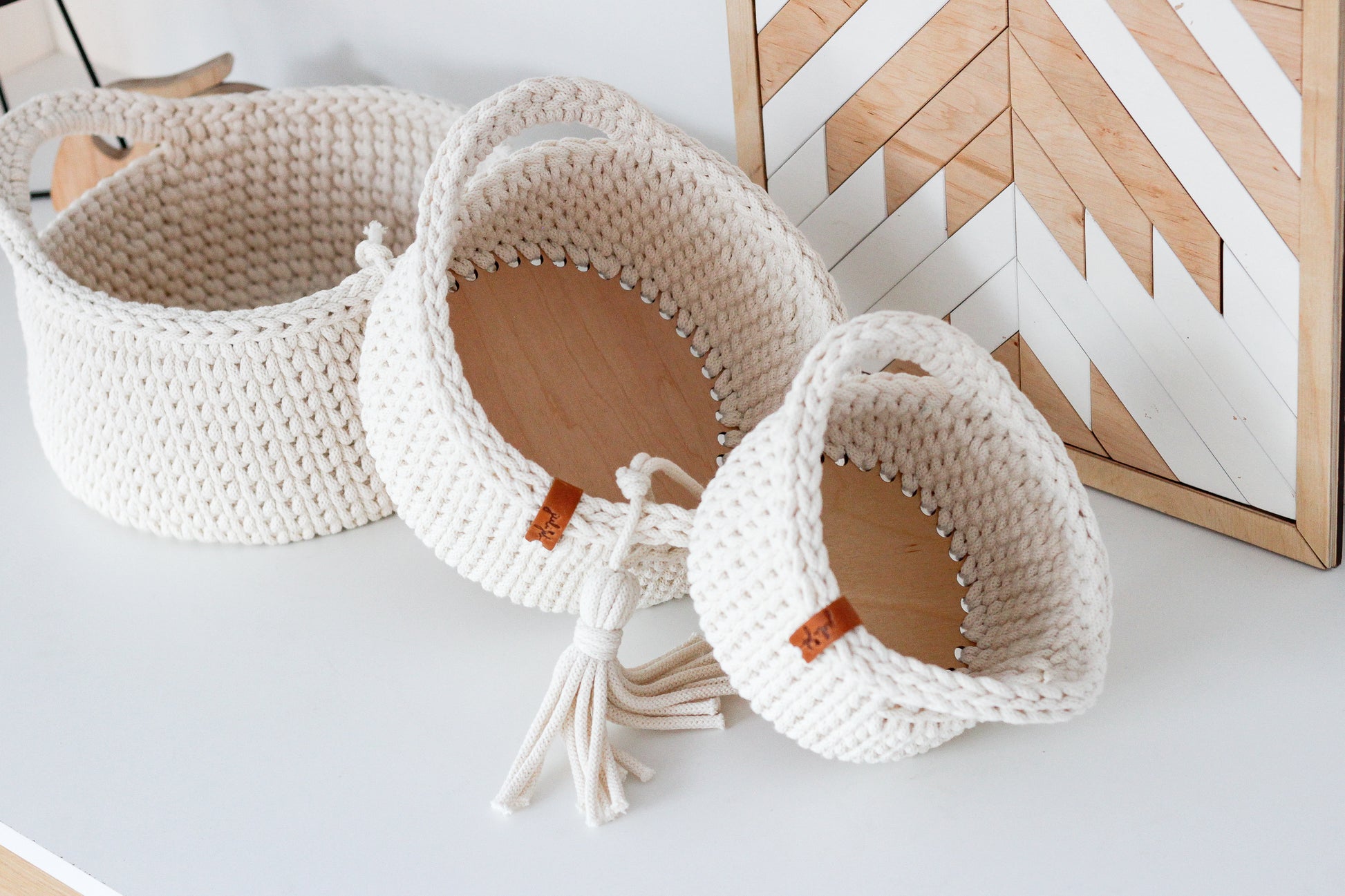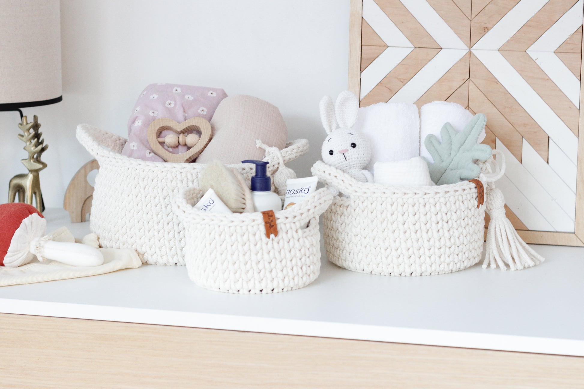 Crocheted Storage Baskets with handles and nice, playful tassels - are a great, beautiful, and very comfortable solution to arrange the changing table space. They will be very helpful to store diapers, nappies, clothes, toys, baby care products, and much more. Everything you need to take care of your baby is beautifully organized at your fingertips. It looks great and cozy in any corner of your nursery.
