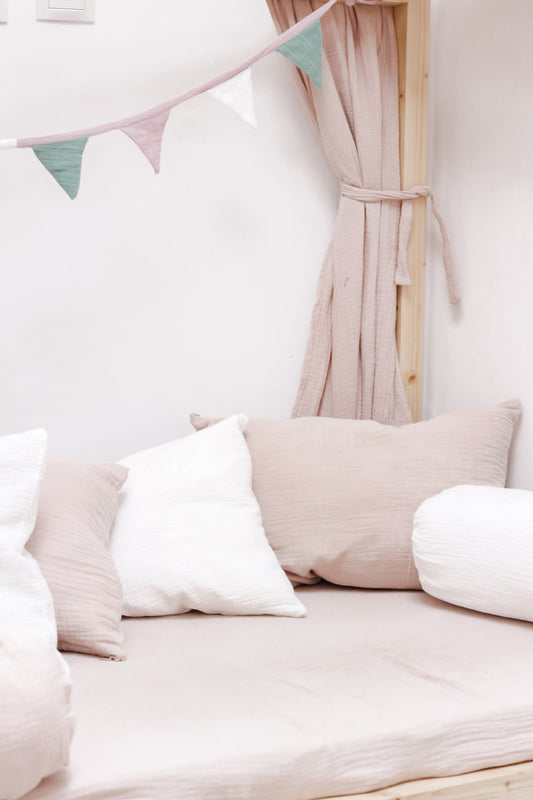 Explore our Montessori House Bed collection featuring Muslin Textiles. Curate a cozy and comfortable sleeping environment for your little ones with canopy, fitted sheets, pillows, and blankets. Crafted from natural and certified materials